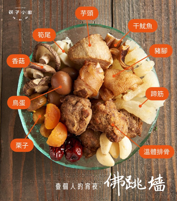 主成分: 香菇、干魷魚、栗子、溫體排骨、豬腳、蹄筋、鳥蛋、芋頭、筍尾