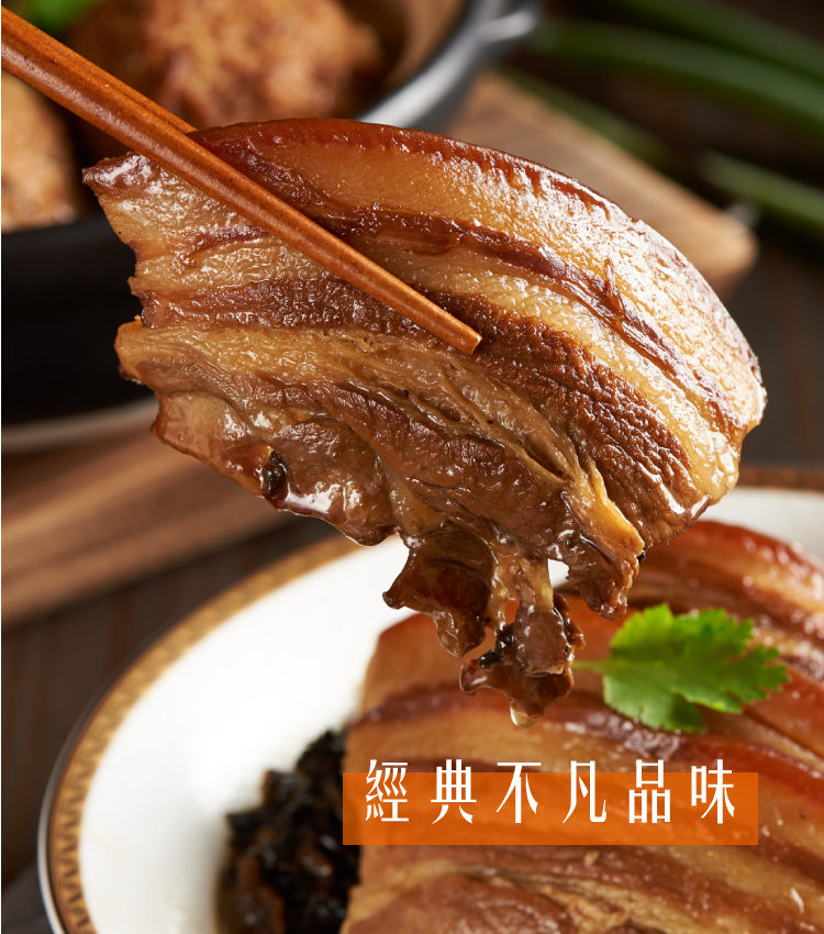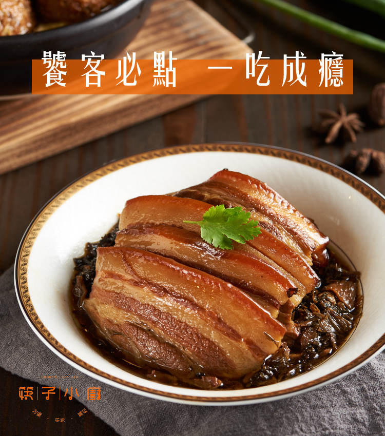 嚴選沒有豬騷味的台灣溫體豬,先高溫油炸逼出油脂、以蔥烤油拌炒增加香氣。梅乾菜一定要是炒過的才夠香,加上秘製中藥材及清爽解膩的烏龍茶梅增加酸味,入口即化的豬肉及富有層次的味覺饗宴絕對讓你一口對味。